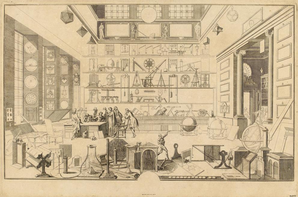 In einem imaginierten idealen Schauraum setzt der französische Maler und Kupferstecher Sébastien Leclerc (1637–1714), der in Paris selbst Geometrie und Mathematik studiert hatte, in diesem Kupferstich wissenschaftliche Geräte, Kunstwerke und zahlreiche Modelle verschiedenster Maschinen und physikalischer Experimente zentral in Szene. Leclerc sammelte selbst derartige Modelle während seines Studiums und präsentiert sie hier kunstvoll arrangiert.